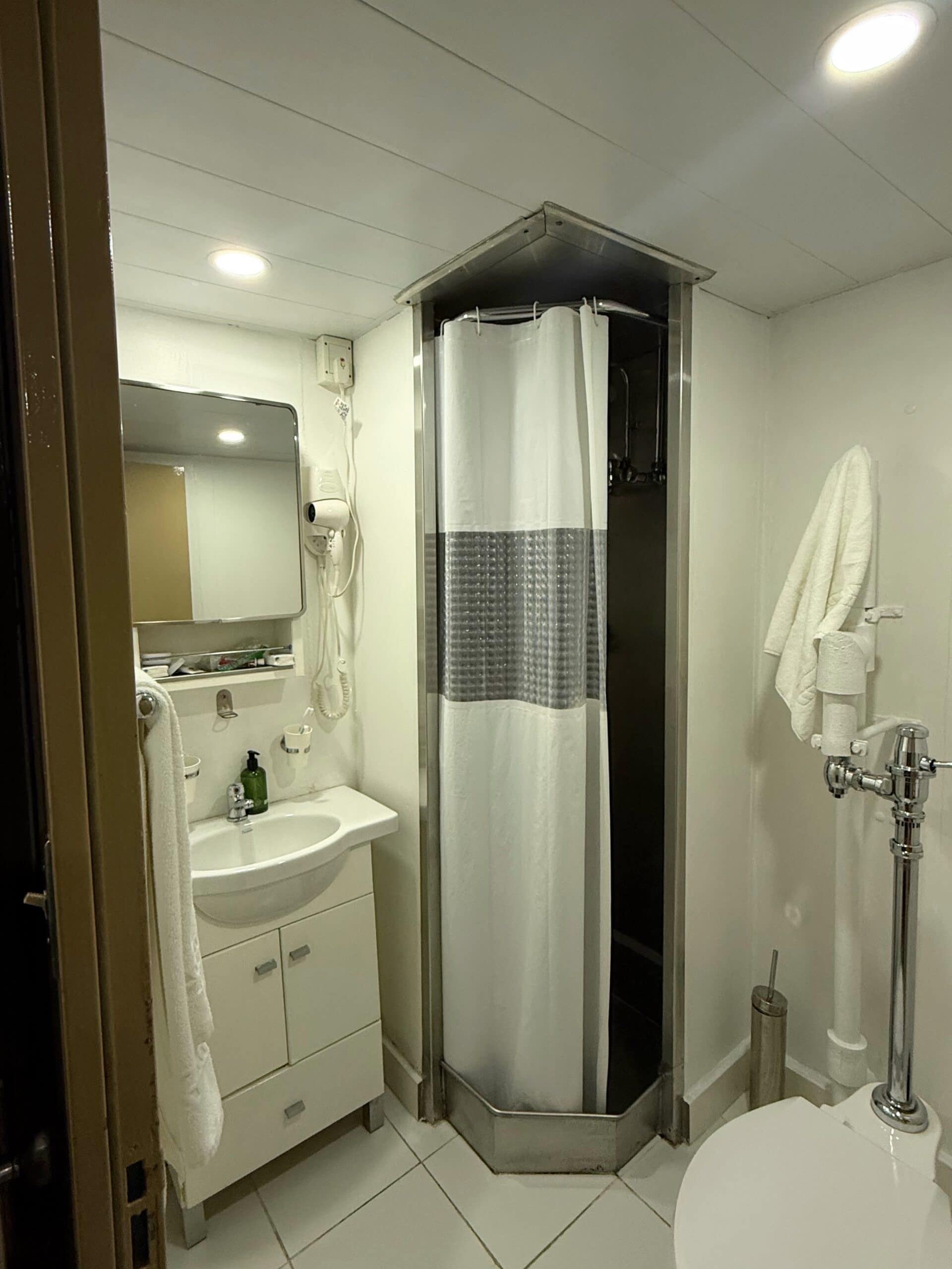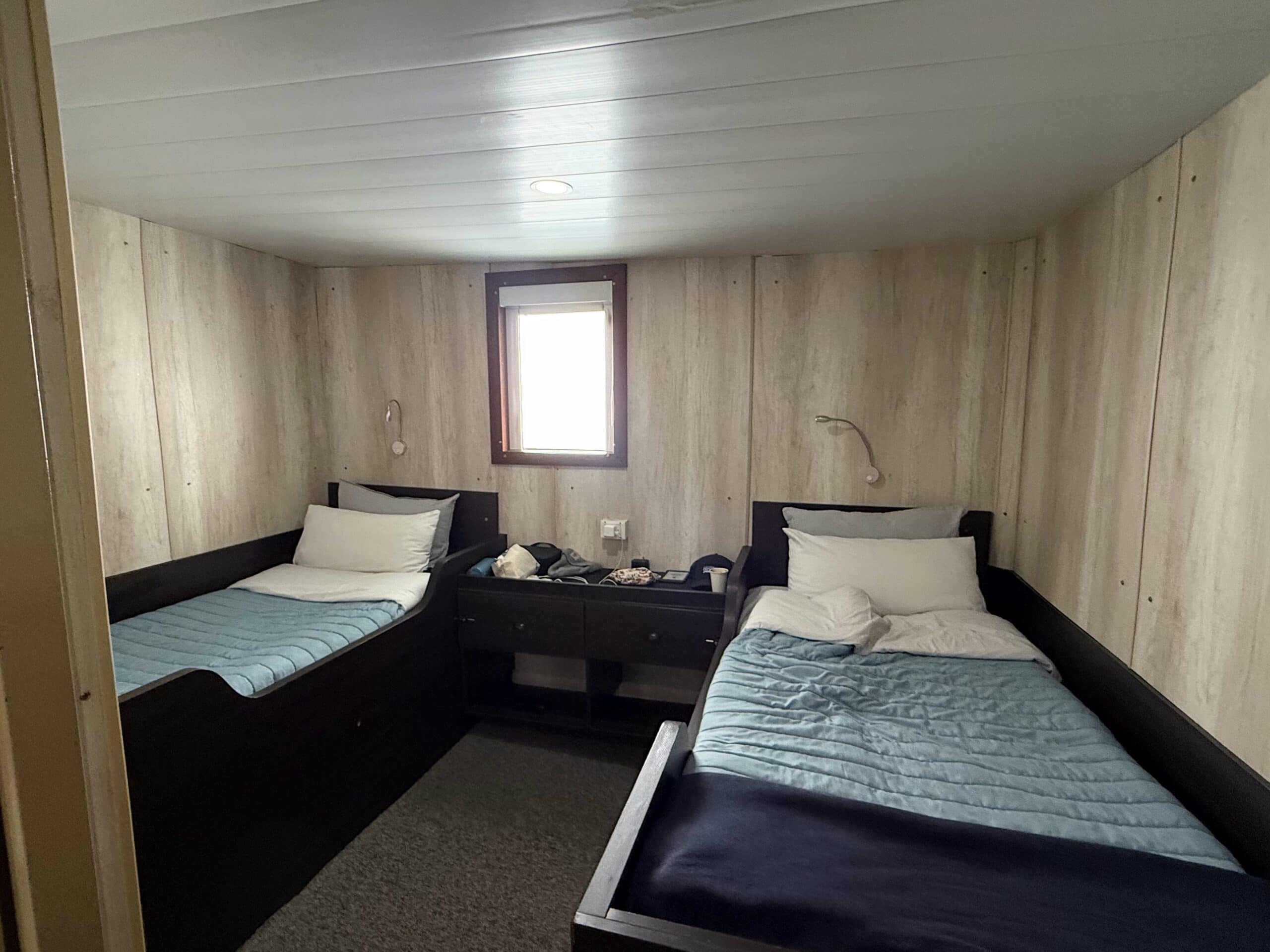 Our humble abode with private bathroom! There were many different room classes and configurations on the ship. They ranged from individual suites to shared bunk style rooms with shared bathrooms. Our swas a Superior Twin Cabin and we were very happy with the space.