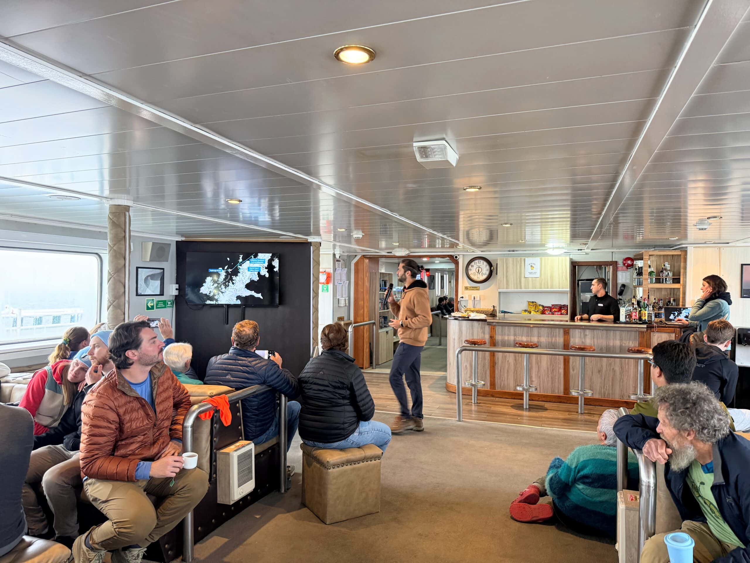 If you are looking for a luxury cruise, this is not for you. The food is good, but not excellent, the bar is cheap and cheerful and the lounge is comfortable and social. There is lots of deck space to explore and big windows in all the main areas which made the social areas great for sightings. The daily briefings by the onboard Historian and Biologist were great and the 24/7 coffee machine was also amazing.